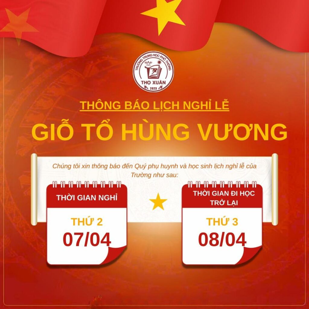 LỊCH NGHỈ GIỖ TỔ HÙNG VƯƠNG 10.3 ÂM LỊCH. Trường THPT Thọ Xuân xin gửi đến Quý phụ huynh và các em học sinh lịch nghỉ Lễ Giỗ tổ Hùng Vương (10.3 ÂL) như sau:Thời gian nghỉ: Thứ Hai – ngày 07/4/2025Thời gian học tập trở lại: Thứ Ba – ngày 08/4/2025 THI KHẢO SÁT LỚP 11 NĂM HỌC 2024 – 2025, TRƯỜNG THPT THỌ XUÂN HÀ NỘI CÔNG BỐ CHỈ TIÊU LỚP 10 NĂM HỌC 2025 – 2026