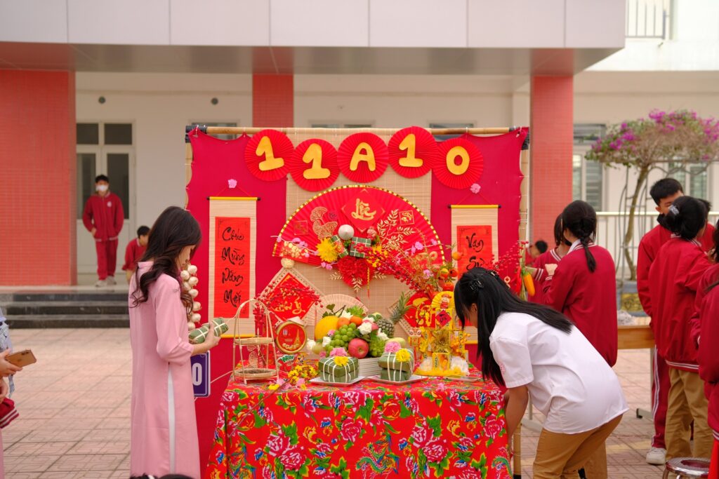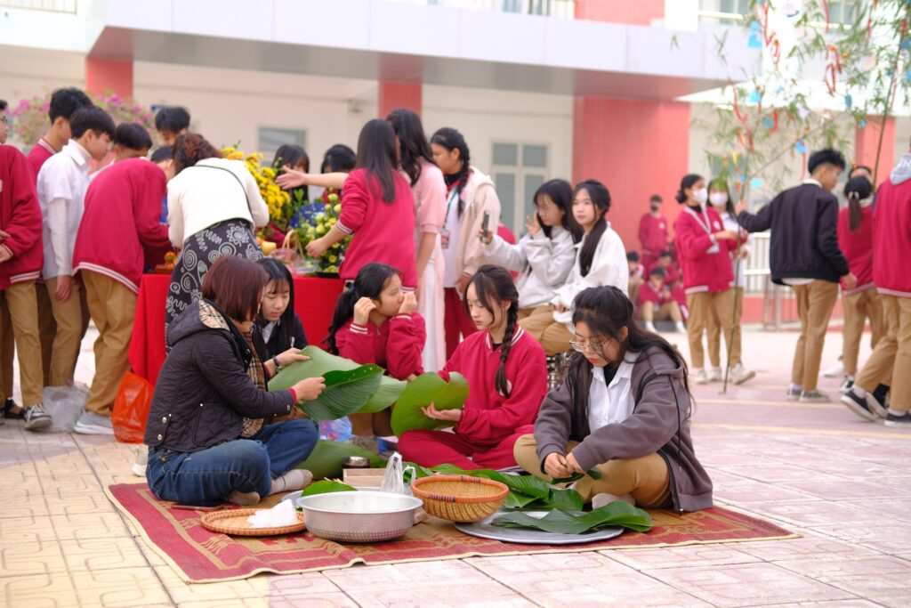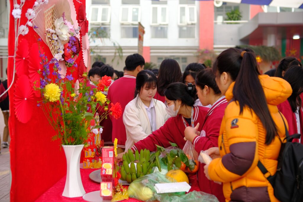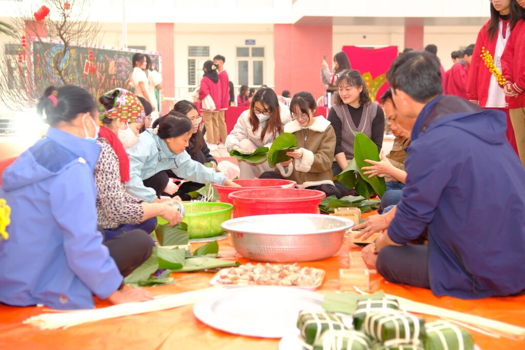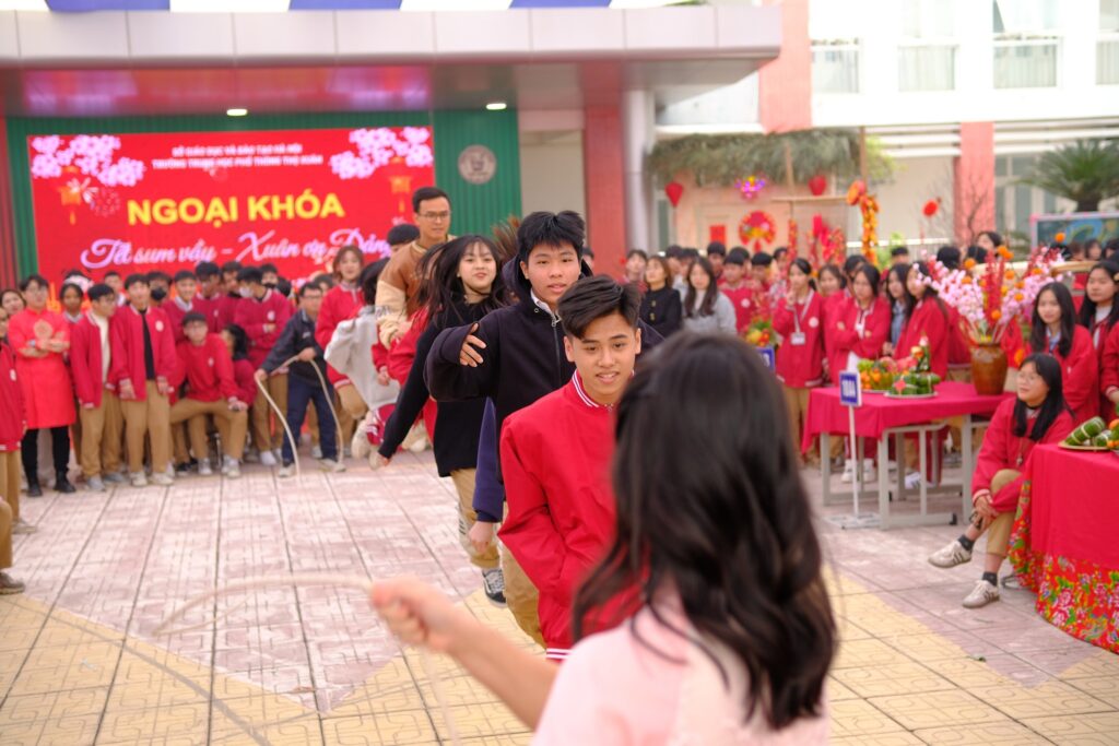 Ngay từ sáng sớm, sân trường đã ngập tràn sắc xuân với cờ hoa rực rỡ, những gian hàng trưng bày mang đậm bản sắc dân tộc. Học sinh háo hức tham gia các hoạt động trải nghiệm như thi gói bánh chưng, bày mâm ngũ quả và nhảy dây tập thể.