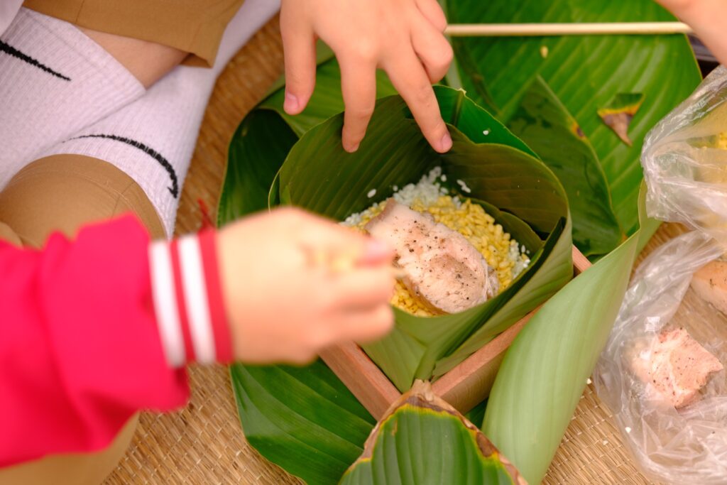Ở khu vực gói bánh chưng, các đội thi nhanh chóng bắt tay vào công việc. Dưới bàn tay khéo léo, từng chiếc bánh vuông vức, xanh mướt được hoàn thành trong sự cổ vũ nồng nhiệt. Tiếng cười nói rộn ràng, niềm vui hiện rõ trên khuôn mặt các em khi được tự tay gói những chiếc bánh mang đậm hương vị ngày Tết.