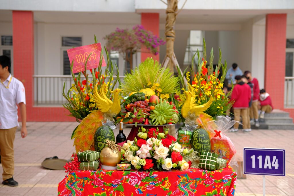 Không kém phần sôi động là phần thi bày mâm ngũ quả. Mỗi đội đều thể hiện sự sáng tạo khi sắp xếp trái cây thành những hình ảnh ý nghĩa như “Tài – Lộc – Thịnh – Vượng”, thể hiện mong muốn một năm mới an lành, sung túc.